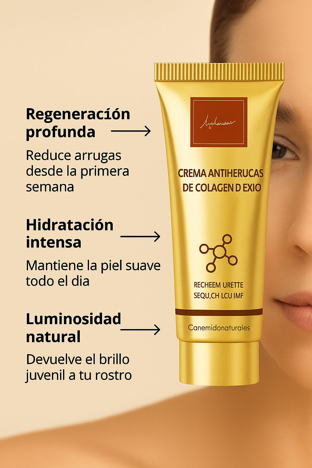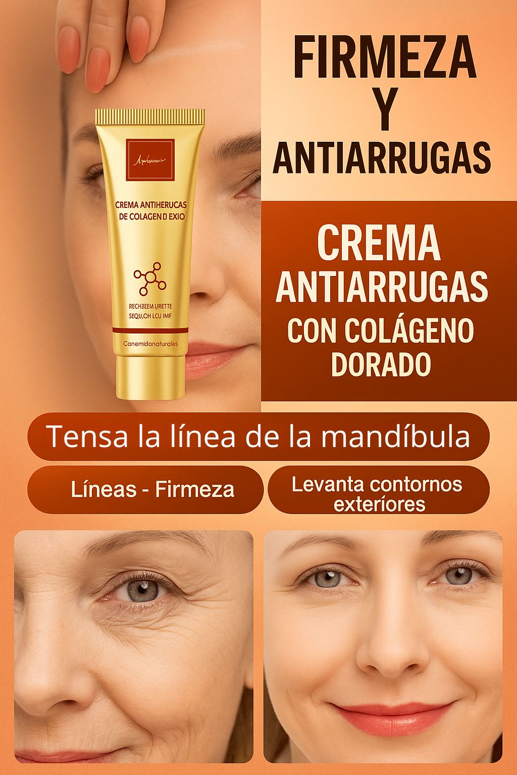 Descubre cómo nuestra CREMA DE COLÁGENO DORADA transforma tu piel, reduciendo arrugas y revelando un rostro más firme, luminoso y con un aspecto visiblemente rejuvenecido.